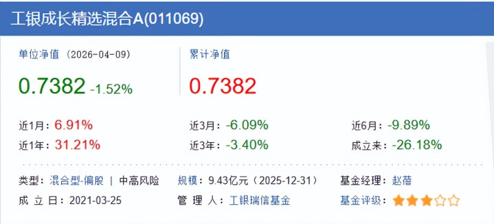 至于她那只工银成长精选混合A,更是让人一言难尽。这只基金2021年成立到现在,累计回撤26.18%,近3年收益-3.40%。