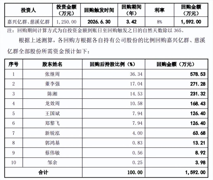 据披露,嘉兴亿群、慈溪亿群投资金额为1250万元,假设回购触发时间为2026年6月30日,且慈溪亿群、嘉兴亿群投资期内已取得的分红收益小于年化8%的单利回报,则相关回购金额为1592万元,其中张继周、董李强、陈湘回购金额分别为578.53万元、271.28万元、231.32万元。