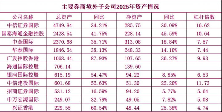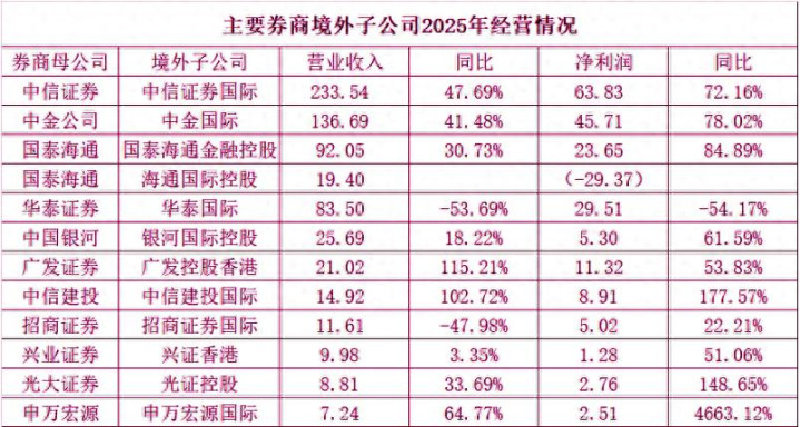 近年来,券商“出海”步伐持续加快,国际化已成为行业重要增长点,尤其2024-2025年境外市场火热,券商境外子公司的经营表现备受关注。据中国基金报记者统计,2025年主要券商境外子公司业绩普遍高增,资产规模大幅扩张,头部梯队格局清晰。